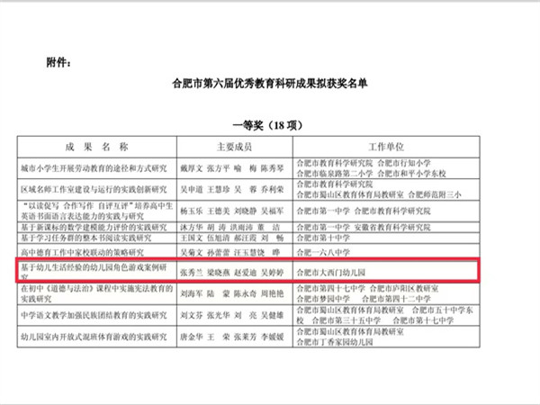 全体教师以课题为载体,积极参加省、市、区级各项评比并获得奖项,多篇论文在《教育前沿》《现代幼教》《中国青年报》等刊物上发表。本次获得第六届合肥市优秀教科研成果一等奖,是对大西幼教育集团总园近年来扎实开展教研工作的表彰和鼓励,更进一步激励全体教师向着更高的教研层次不断进步。大西幼将在“以研兴园、以研促教”的道路上深耕细耘,谱写科研新篇章!