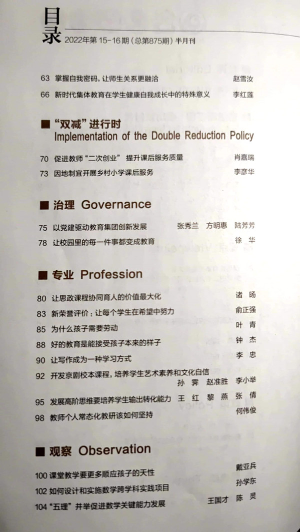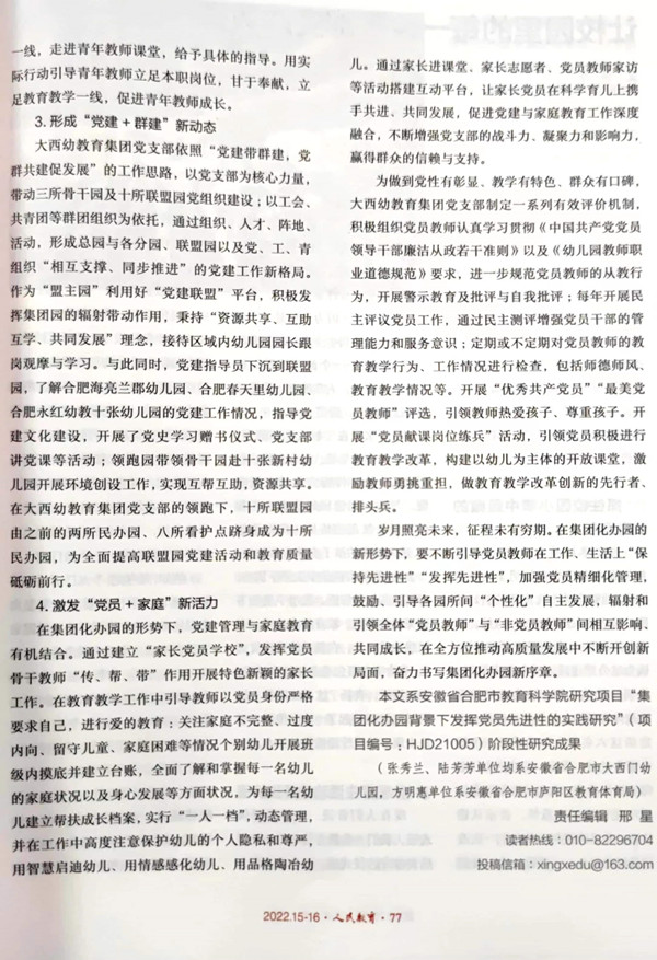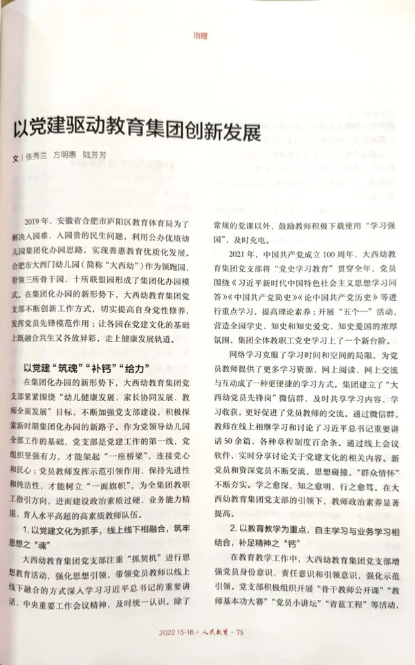 2022年9月,由合肥市大西门幼儿园教育集团党支部书记、总园长张秀兰、副园长陆芳芳、合肥市庐阳区教育体育局幼教教研员方明惠撰写的大西幼教育集团市级党建课题阶段性成果文章《以党建驱动教育集团创新发展》在2022年《人民教育》第15-16期出版。这是大西幼教育集团在学术领域的又一次突破,也是庐阳党建教育工作又一令人欣喜的成果。