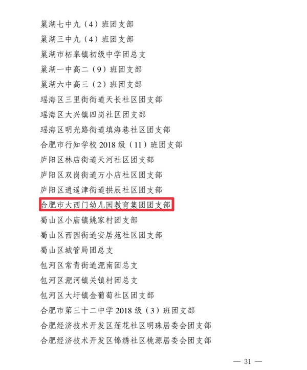 为表彰先进,激励团员、团干部和各级团组织奋发有为,发挥先锋模范作用。2021年4月27日,共青团合肥市委员会公布了《关于表彰2020年度“全市优秀共青团员”、“全市优秀共青团干部”、 “全市五四红旗团委(团支部)”的决定》,合肥市大西门幼儿园教育集团团支部荣获2020年度“合肥市五四红旗团(总)支部”荣誉称号,成为合肥市幼儿园中唯一获此殊荣的团组织。