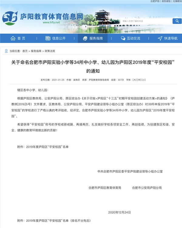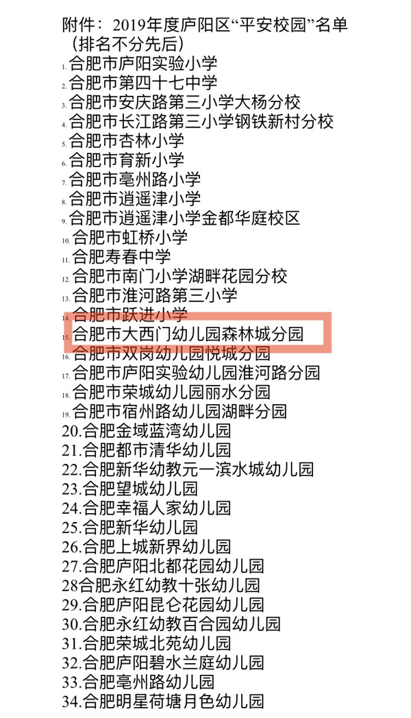 根据庐阳区教体局、公安庐阳分局、原区综治办《关于印发<庐阳区“十三五”时期平安校园创建活动方案>的通知》(庐教体[2016]5号),大西幼教育集团森林城分园荣获“2019年度平安校园”荣誉称号。