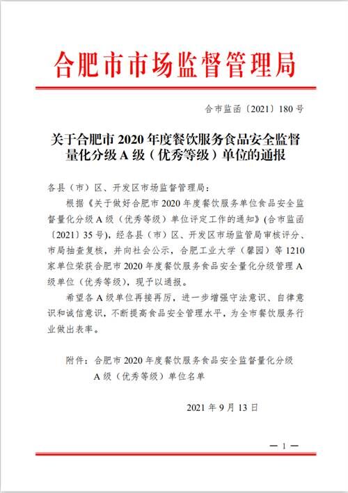 合肥市大西门幼儿园教育集团畅和分园:喜报!荣获合肥市2020年度餐饮服务食品安全监督量化分级管理A级(优秀等级)单位