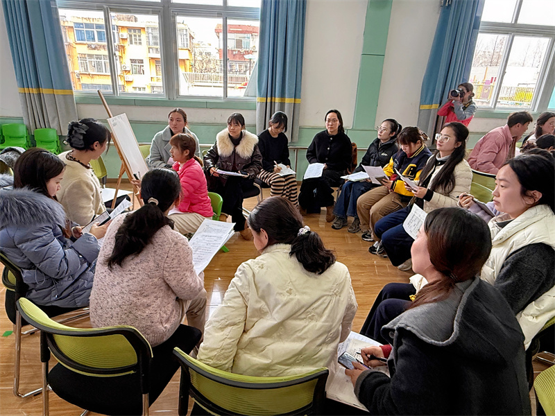 观摩结束后,全体教师分小组围绕“面向全体与关注个体的平衡”“有效师幼互动的实践抓手”“抽象概念的幼儿理解路径”三个核心问题展开深度研讨。大家结合课例,从目标设计、师幼互动、材料投放等角度切入,既有亮点的提炼,也有优化建议的碰撞,在交流中进一步明晰了数学活动设计与组织的关键要点,研讨氛围热烈而深入。