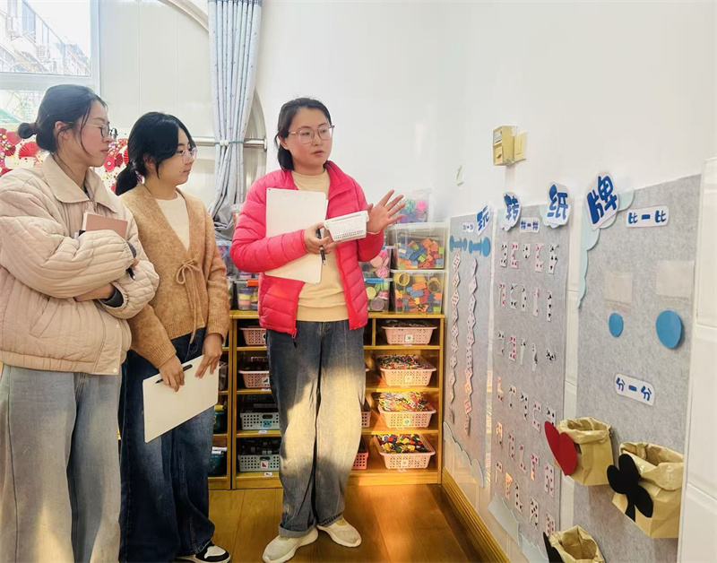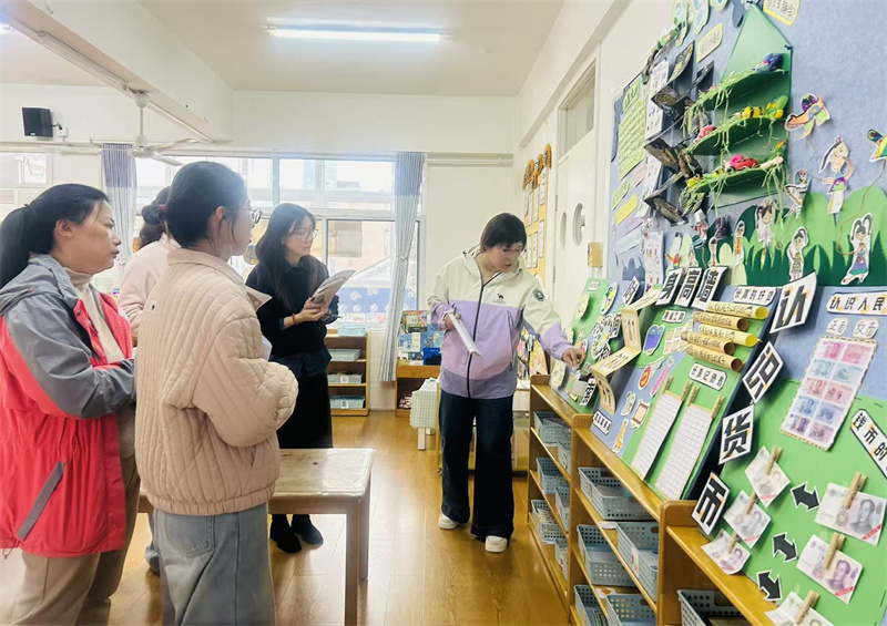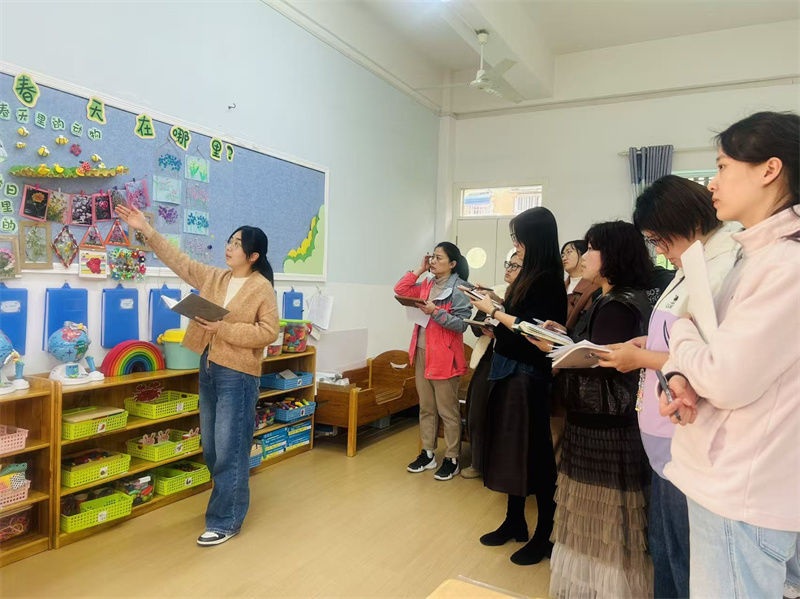 观摩环节,教师们走进班级认真观看。小班聚焦材料多样性投放,让幼儿充分探索数学趣味;中班数学区以瓶盖、雪花片、卷纸筒等低结构材料成为主角,供孩子们进行分类、排序、计数等;大班则呈现更高思维层次,扑克牌、骰子、操作单等整齐收纳,孩子们自主设计的区域标记随处可见,墙面也从装饰转变为“问题墙”“操作墙”,布满幼儿的思维轨迹。主题墙创设方面,各班结合季节与主题活动,呈现了“爱在我身边”“萌宠小铺”“你好春天”等富有童趣的主题墙,孩子们的作品与表征随处可见。自然角里,教师带领幼儿亲手种植、孩子们还为自己的植物设计了独一无二的标识,让自然角成为亲近自然、探索生命的鲜活课堂。