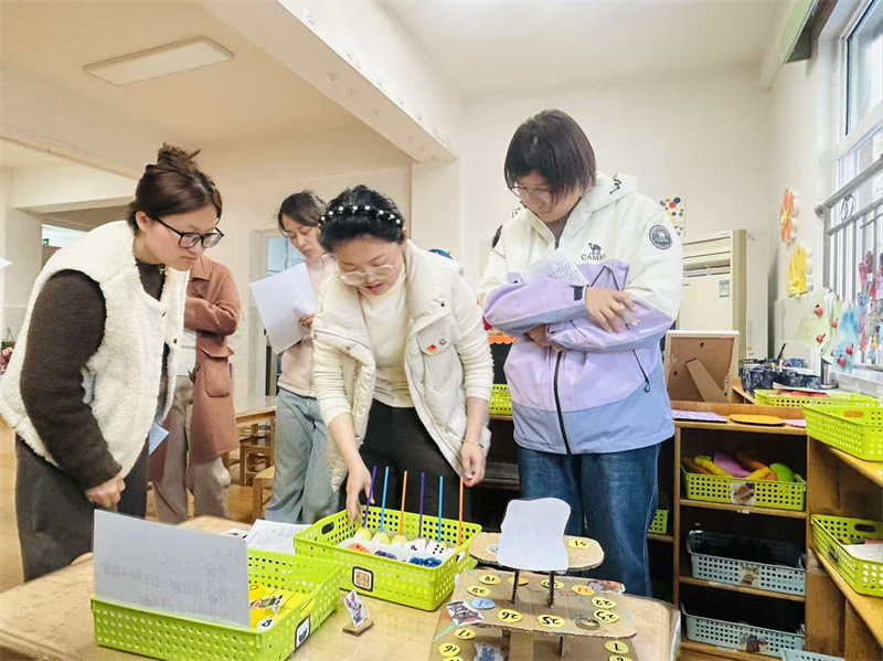 研讨环节,教师们重点围绕如何优化数学区材料投放展开讨论。大家一致认为,数学区材料投放要贴合幼儿的学习与发展需求,以材料为纽带,让幼儿在操作、探究中与同伴、环境产生深度互动。胡仪艳指出:“高质量区域应当是幼儿与材料、与环境、与同伴”互动的场域,材料投放要紧扣数学领域核心经验,注重层次性,让每个孩子找到自己的最近发展区”。