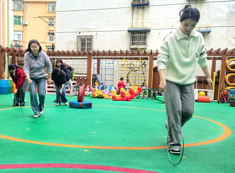 各年级组根据幼儿年龄特点,制定差异化运动目标:中班重点练习“拍球”,提升手眼协调与上肢力量;小班通过趣味场景练习“爬行”,增强身体协调与核心稳定;大班以“跳绳”为核心,强化心肺功能与下肢力量。教师亲身参与,将技能训练融入游戏,激发幼儿运动兴趣。