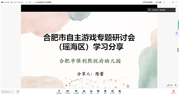 活动伊始,合肥市庐阳实验幼儿园文皖芹老师、合肥市柏景湾幼儿园陈蕾老师分别就近期外出学习收获进行分享。她们结合自身所见、所闻、所思,从前沿教育理念、游戏实践案例、游戏观察分析等方面展开详细阐述,将外出学习的宝贵经验转化为可借鉴的教学思路。