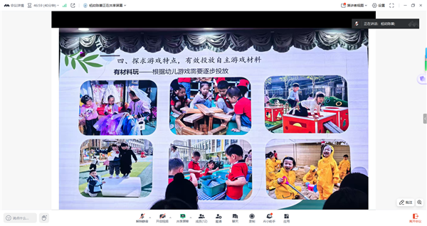 文老师从观察分析幼儿游戏行为的意义、常见的问题、常见游戏的观察分析要点等几方面进行分享。强调观察是一个专业自觉行为,能够促进教师反思和专业成长,教师在观察时要注重学习品质、学习方式、社会性、认知水平、规则遵守、材料投放和教师的指导,记录幼儿游戏活动的客观事实以及在这个过程中发现个体差异,进一步支持发展。
