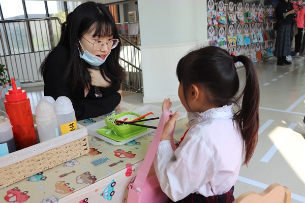 热闹非凡的游戏吸引着每一位观摩老师的眼神,点点细节无一不牵动着每一个环节,幼儿有条不紊、如火如荼的游戏场景使参观老师不由自主地停下脚步,驻足而观参与游戏中。大家纷纷竖起大拇指赞扬森林城老师的智慧教育。“雪儿爱上花甲”、“阿酷交警大队”“海底租车乐”、“嘟嘟公交公司”、“朝源楼海鲜烧烤店”等,各区域串联使得游戏相映成趣,来来往往的不同身份的幼儿使各个区域泾渭分明又千丝万缕。趣味盎然的角色游戏更是让大家乐于其中,“客人老师您好,您要不要吃海鲜面?”“客人老师,您需要租车吗?”……自由参与、自主思考、热情洋溢的“老板们”感染着每一位客人老师参与其中。