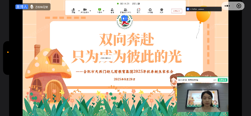 初秋启新程,家园共携手。为帮助小班新生家长解开入园疑惑、缓解育儿焦虑,搭建家园共育的温暖桥梁,2025年8月28日上午,合肥市大西门幼儿园教育集团森林城分园以云端为媒,召开小、托班新生线上家长会。会议由森林城分园保教副主任吴勤勤主持,全体小、托班教师与家长云端相聚,共话孩子入园初成长。
