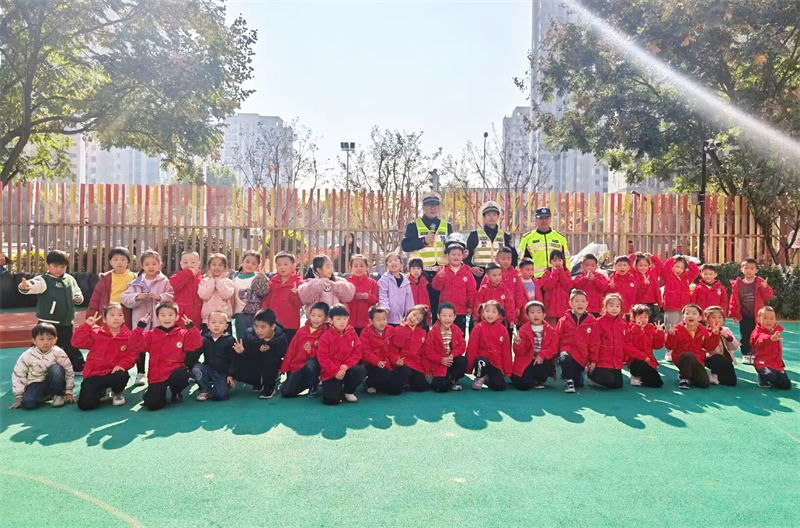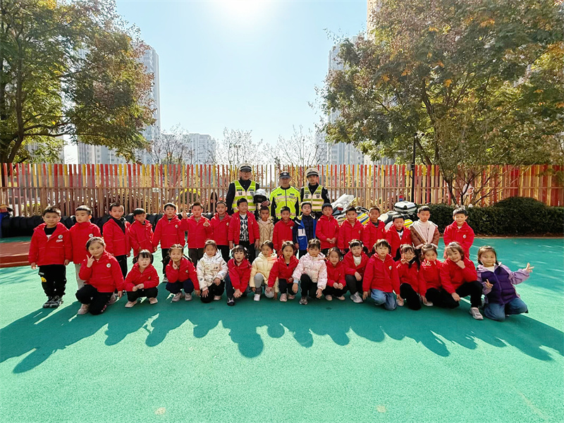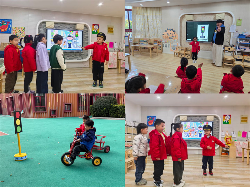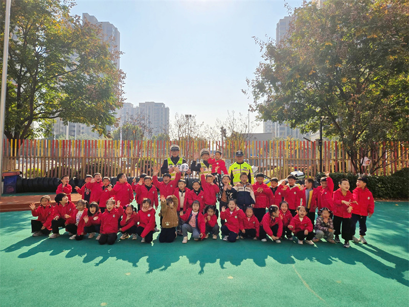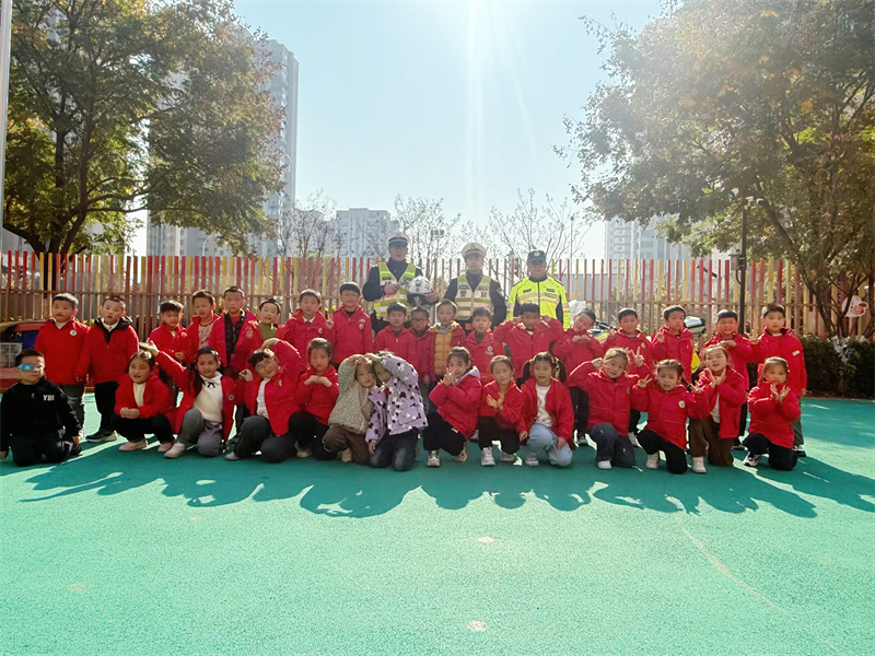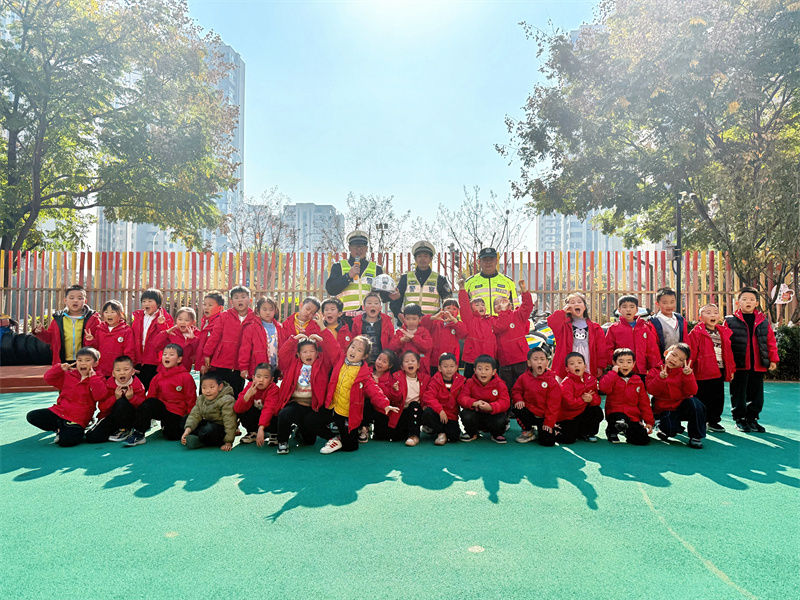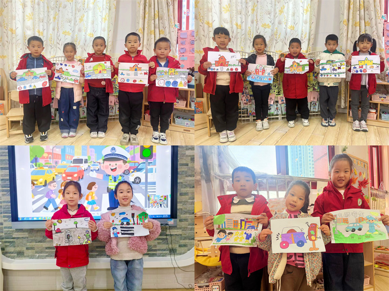 大六班丁清禹的爸爸,携同事为大班孩子带来交通安全课堂。他示范安全头盔佩戴方法、讲解卡扣重要性,通过问答环节互动,孩子们踊跃抢答车门开启方向、安全座椅使用等问题;无人机巡讲环节让大家兴奋不已,孩子们仰望空中“安全卫士”,聆听其道路守护作用,活动尾声还与交警叔叔合影留念。随后,“交通安全小剧场”里孩子们化身“小交警”“小司机”模拟指挥交通,海报绘画活动中用画笔展现交通安全元素,巩固了文明出行的好习惯。