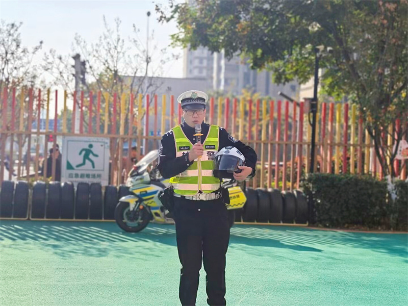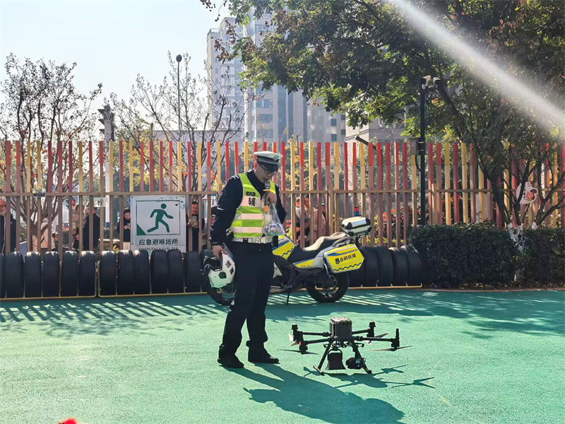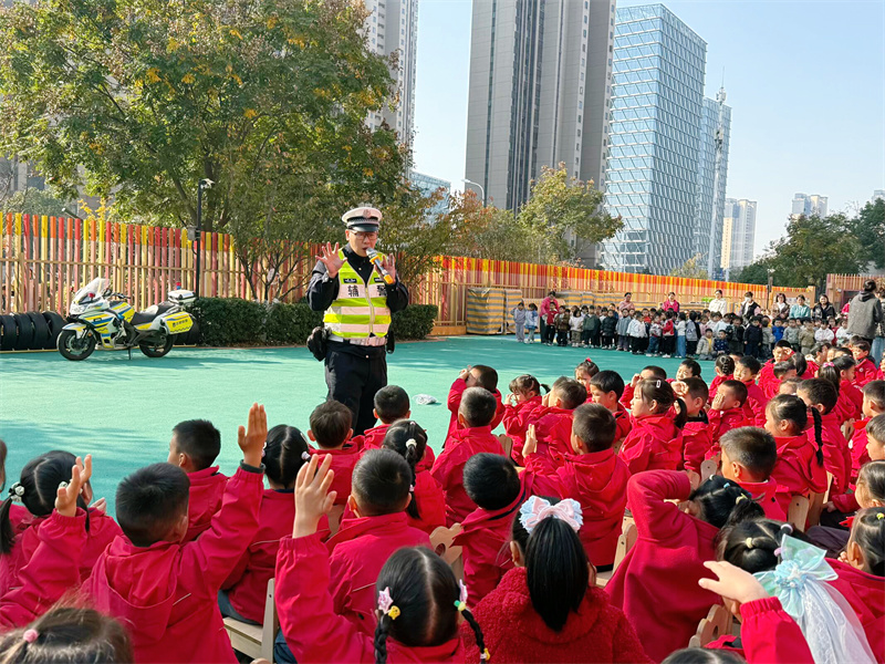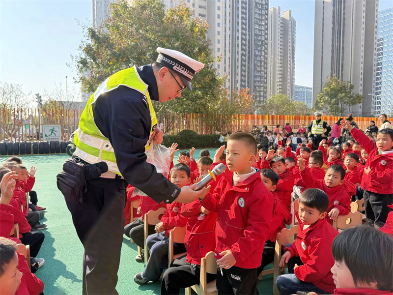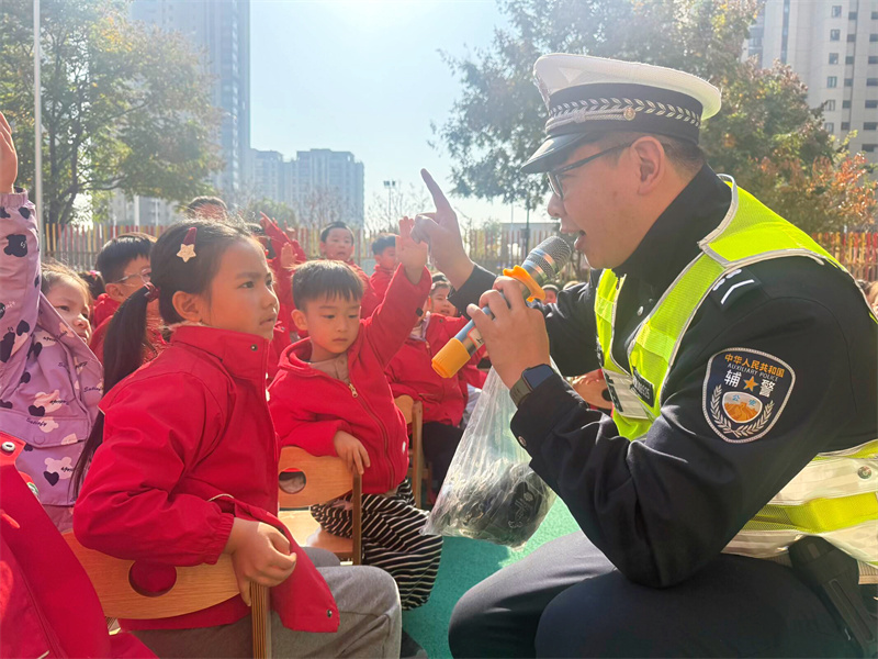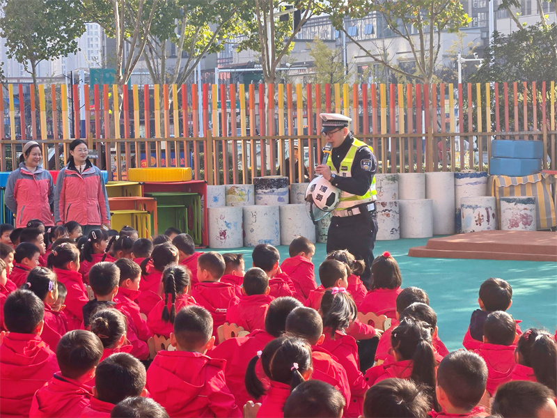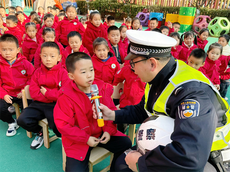 大六班丁清禹的爸爸,携同事为大班孩子带来交通安全课堂。他示范安全头盔佩戴方法、讲解卡扣重要性,通过问答环节互动,孩子们踊跃抢答车门开启方向、安全座椅使用等问题;无人机巡讲环节让大家兴奋不已,孩子们仰望空中“安全卫士”,聆听其道路守护作用,活动尾声还与交警叔叔合影留念。随后,“交通安全小剧场”里孩子们化身“小交警”“小司机”模拟指挥交通,海报绘画活动中用画笔展现交通安全元素,巩固了文明出行的好习惯。