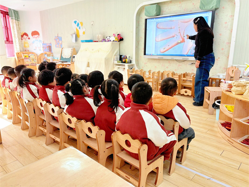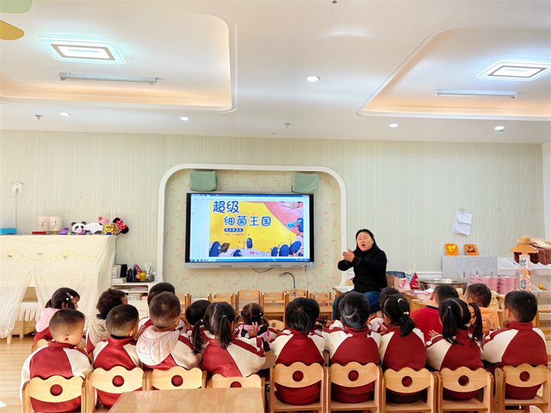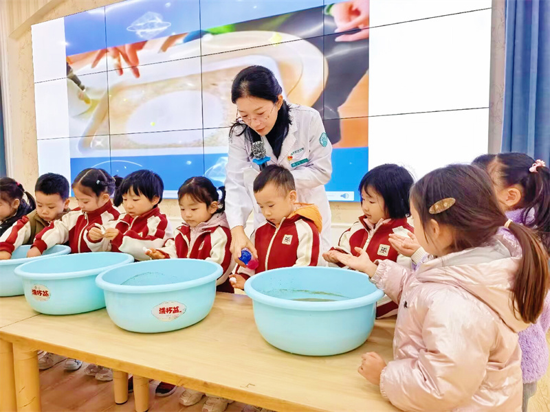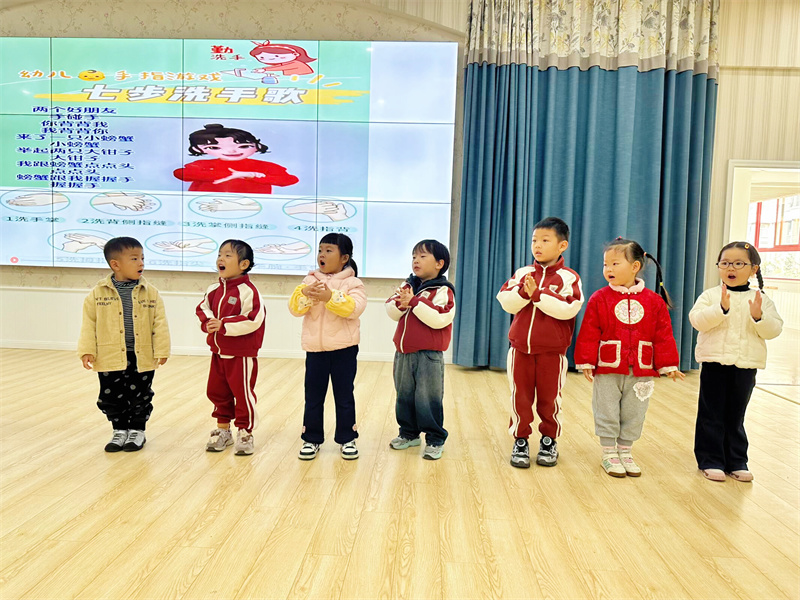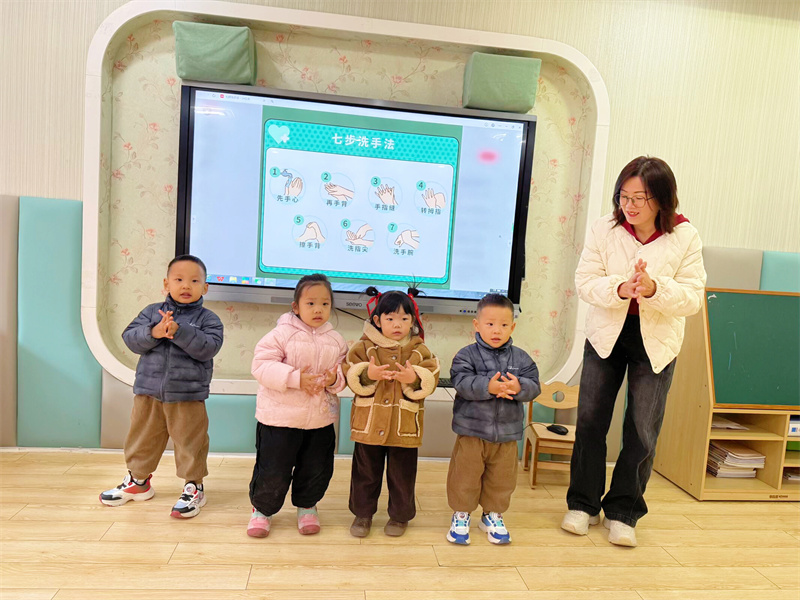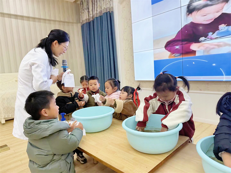 托、小班课堂上,小一班朱博睿的妈妈以“身体小卫士打败秋冬小病菌”为主题分享。她通过PPT和手指操带孩子们认识“身体六宝”,用“感冒小怪兽”等形象比喻讲解秋冬病菌及传播途径,提醒病菌高发时段防护要点。“洗手魔法七步走”和“赶走细菌小实验”深受喜爱,孩子们伴着歌曲掌握洗手步骤,通过胡椒粉模拟病菌的实验直观感受清洁效果。活动后,各班开展“病菌躲避战”,教师化身“病菌使者”,孩子们在追逐互动中强化防护动作;绘本共读活动则借助生动画面,让孩子们进一步了解病菌危害与防护重要性。