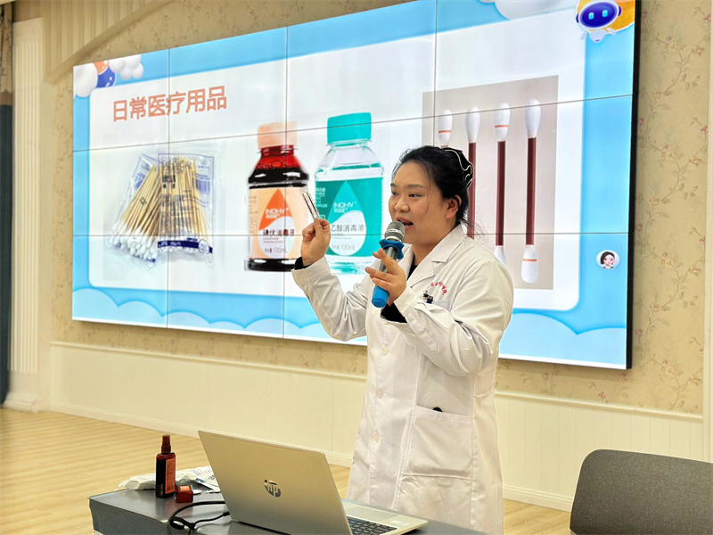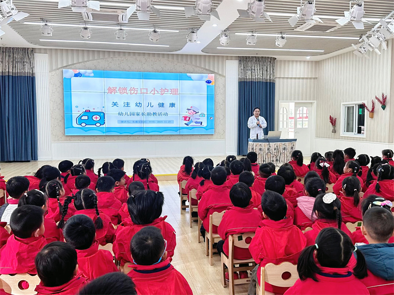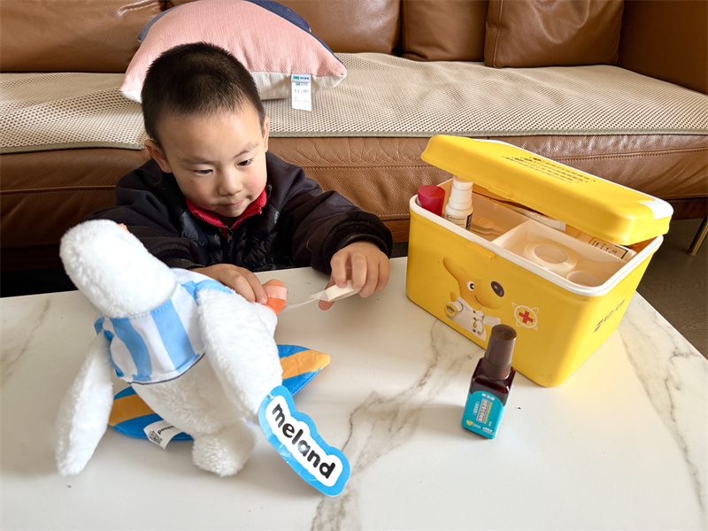 中五班朱嘉文的妈妈,为中班孩子带来了“解锁伤口小护理”的课程。她以提问引发思考,通过PPT介绍碘伏、创可贴等医疗用品,针对擦伤、烫伤、鼻出血等常见情况,传授科学处理方法及120急救电话使用场景,互动环节中孩子们积极提问、充满好奇。活动落幕后,孩子们学习热情不减,纷纷在家中化身“小小护理员”,用玩具模拟伤口处理,在趣味操作中巩固护理技能,驱散对受伤的恐惧,实现知识从课堂到生活的落地。