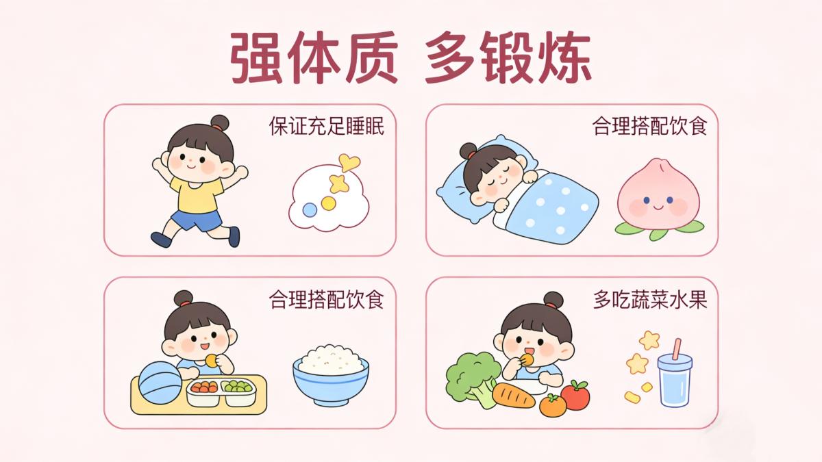 3. 强体质、多锻炼:保证充足睡眠,合理搭配饮食,多吃蔬菜水果,适当进行户外活动,增强孩子自身免疫力。
