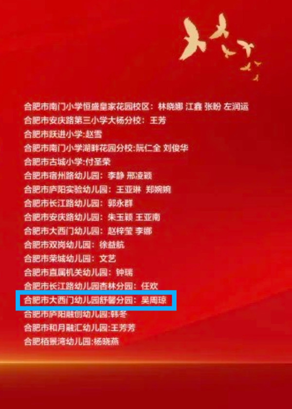 为大力弘扬教育家精神,加快教育强国建设,进一步营造尊师重教的良好氛围,在庐阳区庆祝第40个教师节大会上,合肥市大西门幼儿园舒馨分园教师吴周琼荣获区“优秀教师”光荣称号。