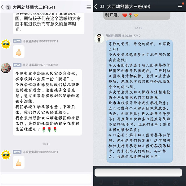 会后,家委会、伙委会委员在班级群内积极反馈。家长代表们纷纷表示,要承担起家委会、伙委会成员的职责,主动参与幼儿园民主管理,积极为幼儿成长、园所管理献言献策,做家长与园所沟通的纽带。