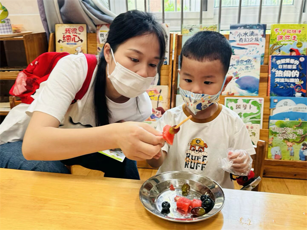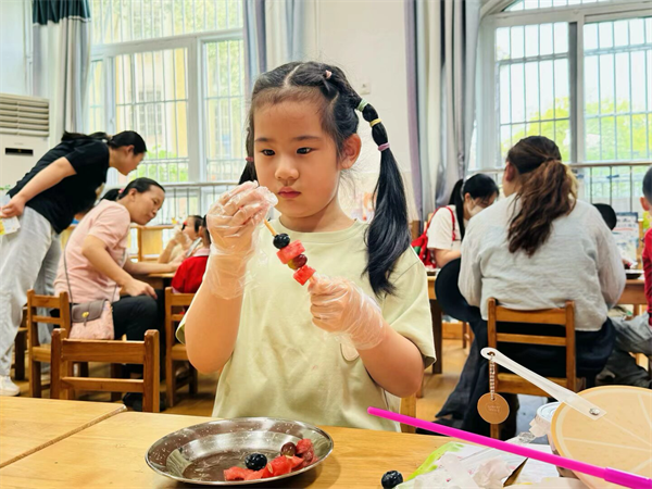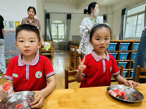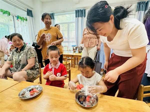 红润的西瓜果肉与提子、蓝莓等水果交替被孩子们用竹签小心翼翼地串成缤纷水果串。快乐的同时体验着自己动手的成功和喜悦,随后大家一起品尝自己制作的西瓜串串,甜蜜的西瓜汁在口中流淌,亲子之间的感情也在这一刻变得更加深厚。