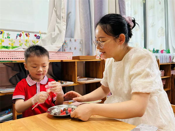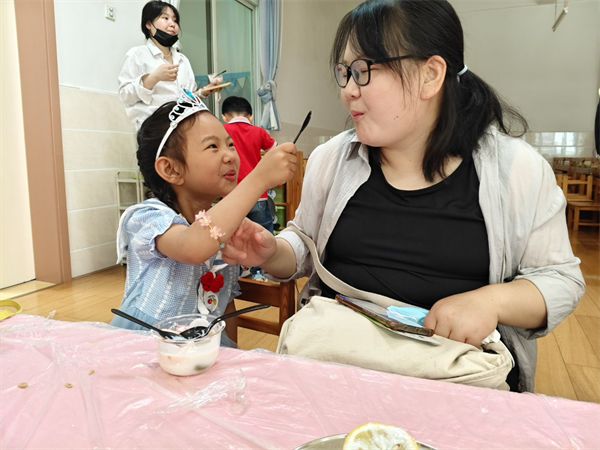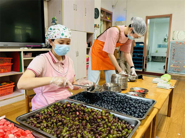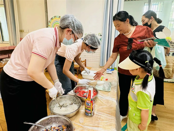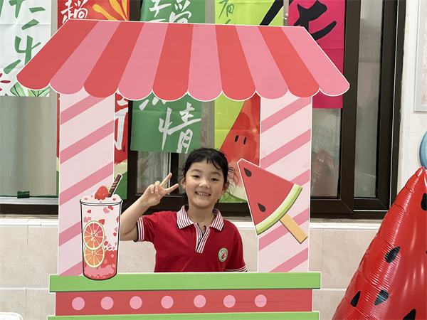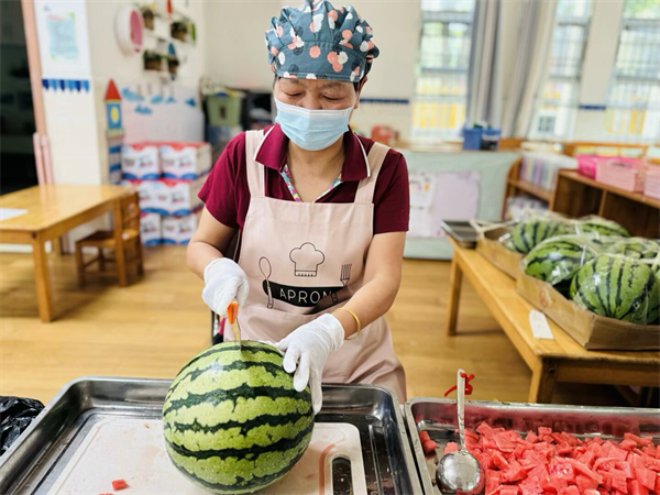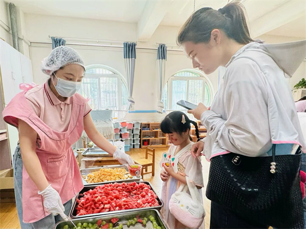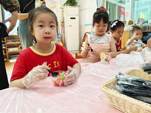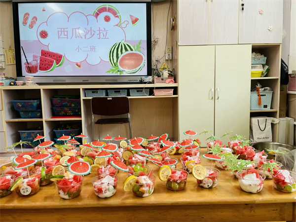 沙拉创作区俨然成了艺术工坊。孩子们将西瓜丁、哈密瓜、酸奶等倒入透明碗中,用小勺搅拌出粉白相间的“云朵沙拉”。当多汁的西瓜和美味的沙拉相结合,一场味蕾的奇妙之旅就此开启,为夏日增添一抹别样的清凉与甜蜜。