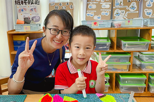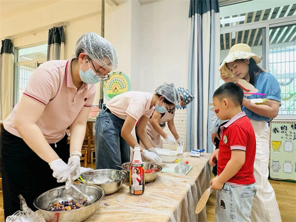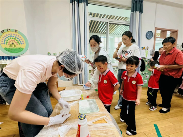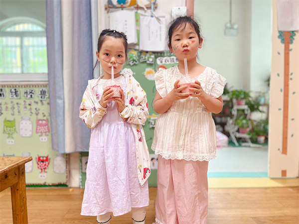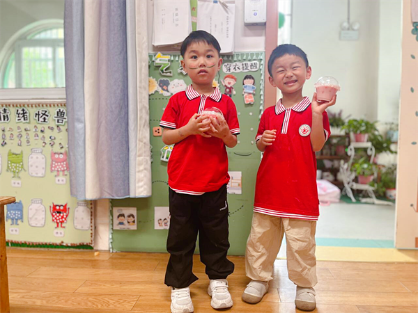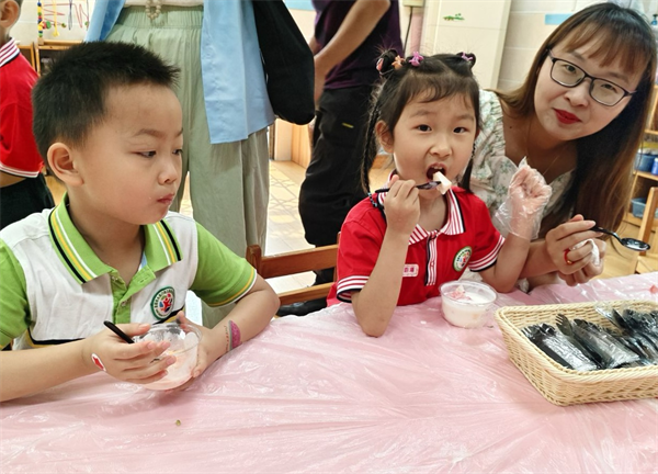 夏日美味的西瓜和晶莹剔透的西米露,会碰撞出怎样的美味呢?西米露制作区飘散着椰香,将煮好的西米倒入西瓜汁中进行搅拌,观察西米在粉红液体里“游泳”的奇妙现象。再将西瓜块放入碗中,一碗碗清凉甜蜜的西瓜西米露就完成了。孩子们迫不及待地品尝自己的作品,哇!夏天的味道真甜呀!