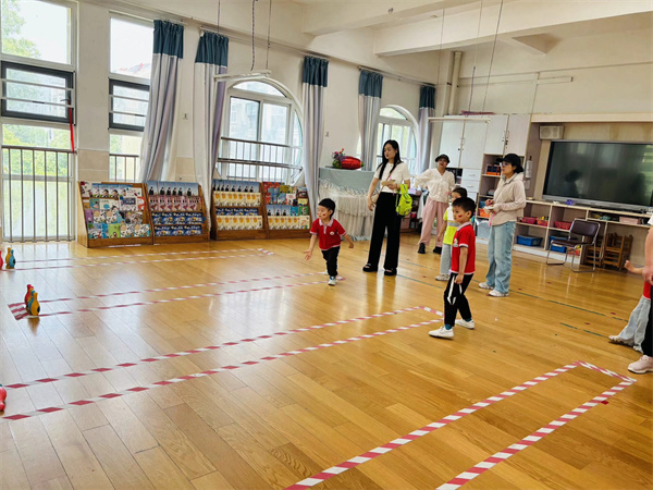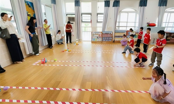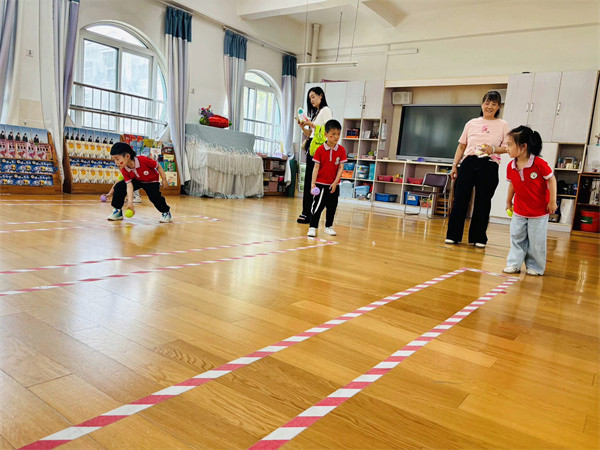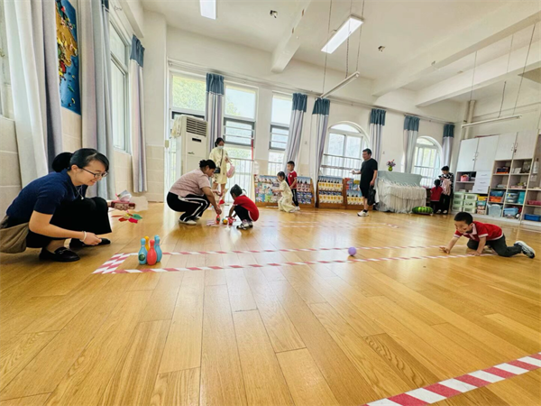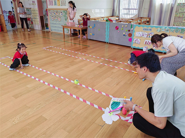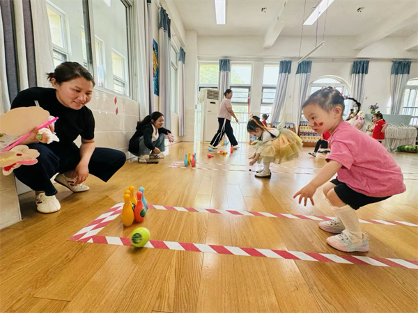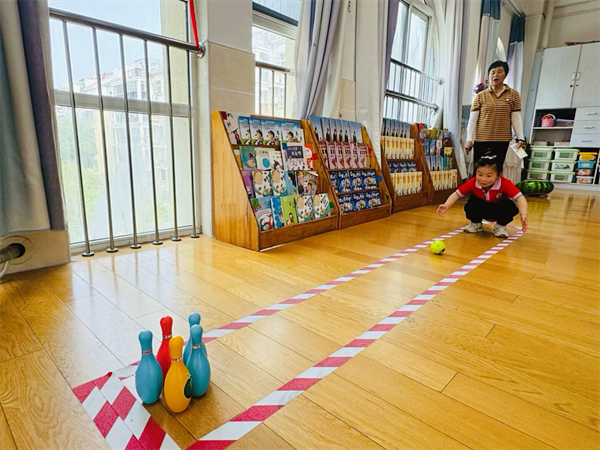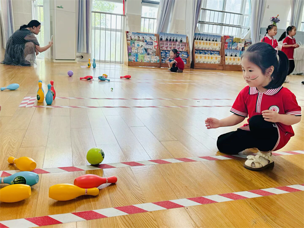 一排排色彩斑斓的“保龄球瓶”整齐地摆放在地面上,孩子们排成一队,化身保龄球手。家长们则在一旁耐心指导:俯身瞄准、奋力一推——“咚!”瓶子应声而倒,当西瓜球撞倒了一个又一个保龄球瓶时,孩子们发出阵阵欢呼,脸上洋溢着成功的喜悦。