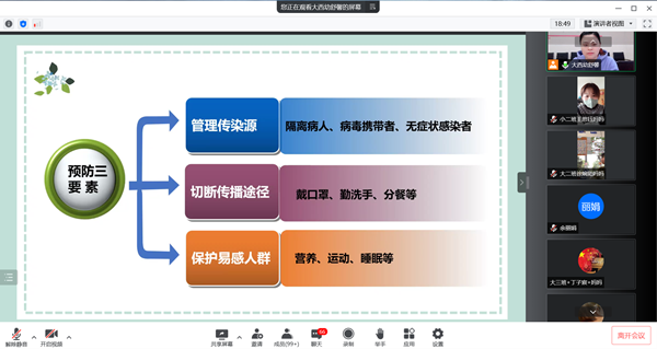首先,舒馨分园园长周媛向大家介绍了幼儿园的各项疫情防控工作,讲解了家长如何支持与配合工作。保健老师轩欢欢和大家分享了“新冠病毒的基本知识”、“家长日常居家如何护幼”、“园所护幼工作”等内容。
