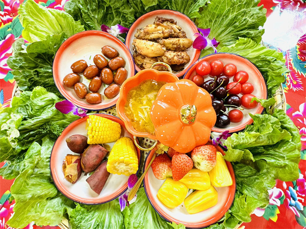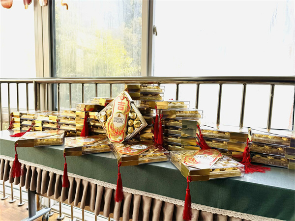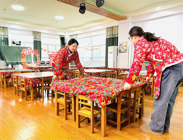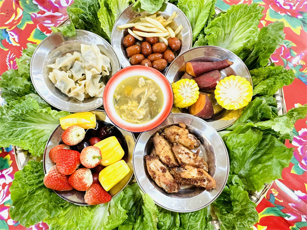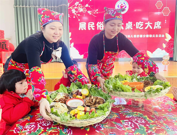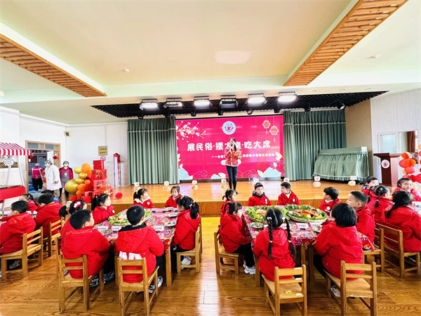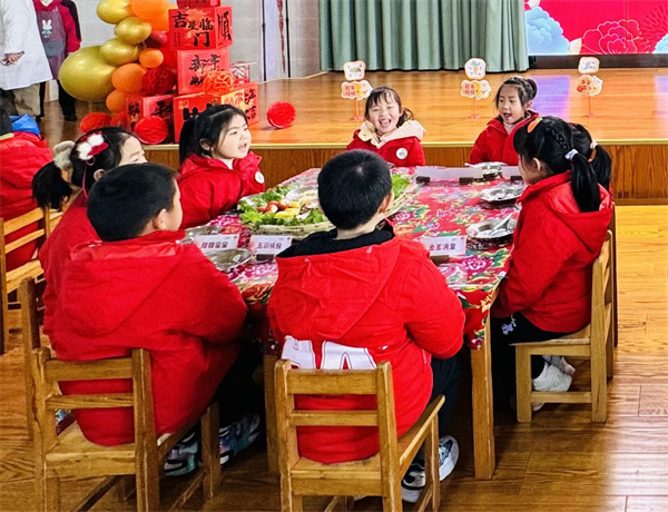 “吃席”是民族社交礼仪的一部分,家里有喜事,亲戚朋友赶过来祝贺道喜,把酒言欢礼尚往来,在一起热热闹闹讨个吉利。为了让孩子们感受传统民俗文化,老师们精心布置音体室的节日氛围,厨师一大早就准备美食:“团团圆圆、大鹏展翅、五彩缤纷、蒸蒸日上、锦上添花、金玉满堂、金汤凤凰、笑口常开、金菠献瑞......”每一道菜品都经过精挑细选,醇香四溢,美味可口,饱含着对孩子们成长的美好期许。