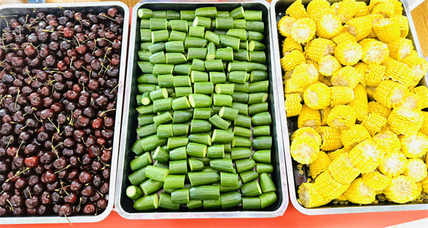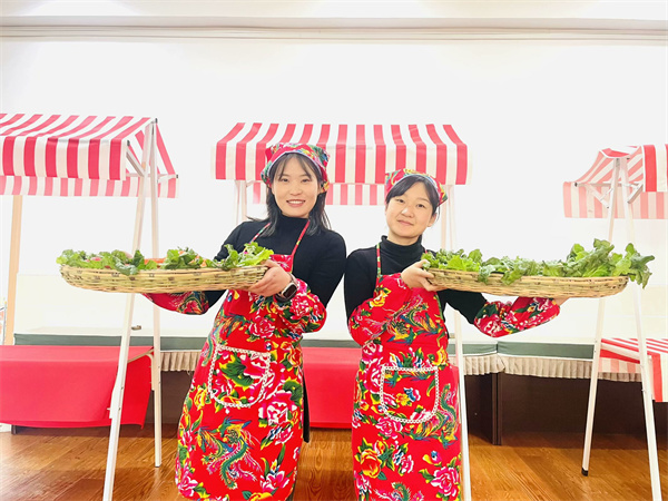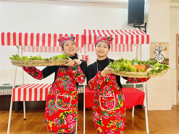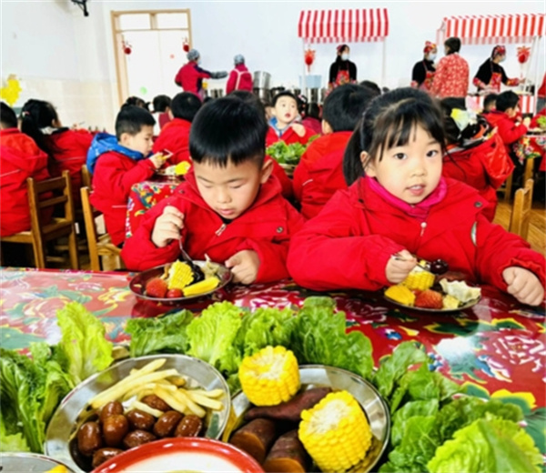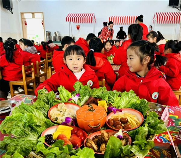 人齐开宴,东家备菜。随着主持老师的一声吆喝,老师们身穿花袄,系着花围裙整齐划一端上美食,孩子们抑制不住地发出欢呼声,脸上洋溢着惊喜的笑容。