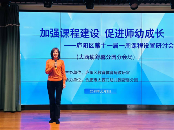 活动开始,合肥市大西门幼儿园舒馨分园党支部书记、园长周媛致欢迎词。她向参会领导和教师表示热烈欢迎。她说学前教育是国民教育体系的重要基石,课程建设对孩子成长至关重要。即将实施的《中华人民共和国学前教育法》也为更科学、更优质的课程建设提供了指引,为教师队伍成长及幼儿全面和谐发展,提供了坚实的法律保障。此次研讨会为大家提供了宝贵的交流平台,大家在这里分享经验、探讨问题、优化课程内容,对推动庐阳区学前教育的高质量发展起到积极的促进作用。