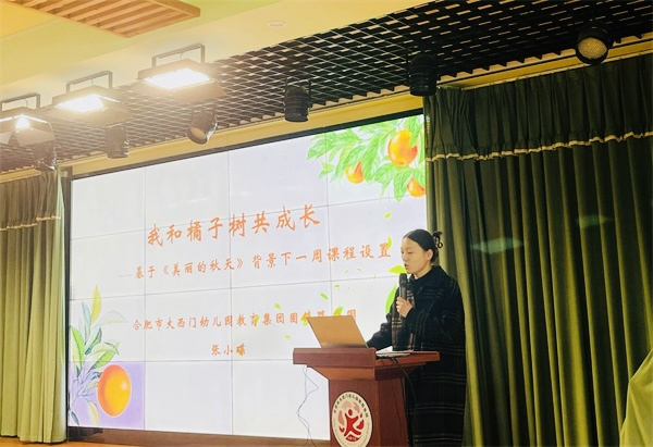 合肥市大西门幼儿园固镇路分园的张小蝶老师带来了“我和橘子树共成长——基于《美丽的秋天》背景下一周课程设置”的分享,引导幼儿通过多种感官观察与探索橘子,加深对橘子的感性认识。