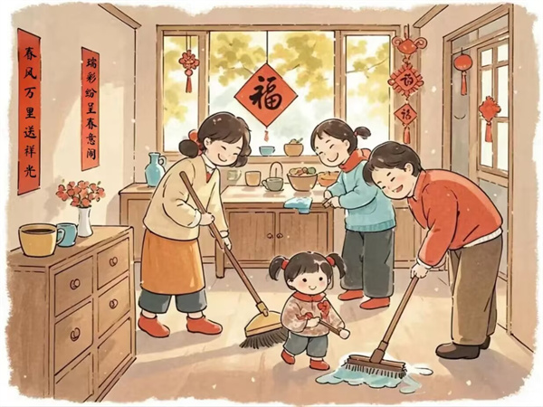 春节前的大扫除是中国的传统年俗,也是去除晦气、迎接喜气的一种方式。扫尘之日,全家上下齐动手,用心打扫房屋、庭院,擦洗锅碗、拆洗被褥,干干净净迎接新年。