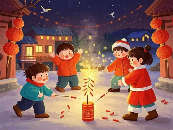 在除夕,人们会燃放鞭炮和烟花,驱赶一年的晦气,迎接新年的好运。