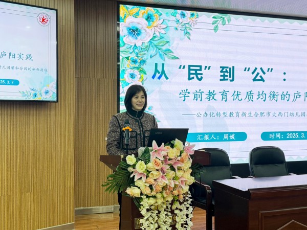 公办化转型的“舒馨样本”。合肥市大西门幼儿园舒馨分园党支部书记、园长周媛以《从“民”到“公”:学前教育优质均衡的庐阳实践》为题,系统解构馨和分园转型之路。从园内硬件设施的改造升级,到教学课程的创新优化,舒馨分园以生动的实例和详实的数据,展现了在新时代学前教育理念引领下,民办幼儿园焕发新生的蜕变之路。