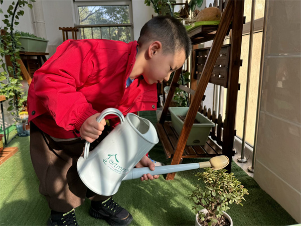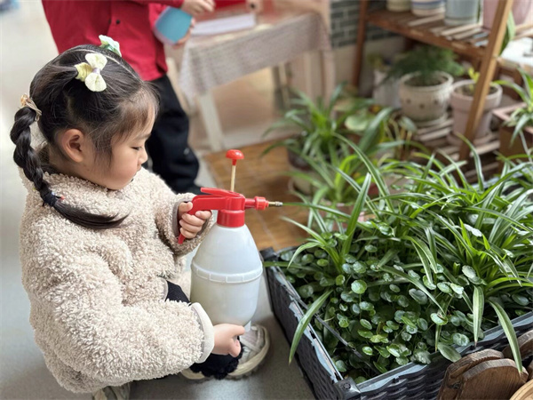 中班的幼儿们不仅通过绘画表达了自己对保护树木的热爱,还积极地将这份热情转化为行动。他们手持洒水壶前往幼儿园的植物角——这是幼儿最喜欢的角落。瞧,幼儿们认真地为小花小草浇浇水、除除草,满心期待地呵护这些植物慢慢长大!