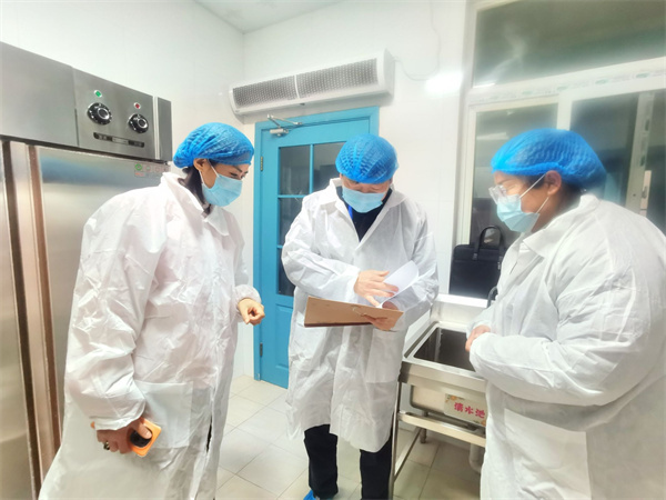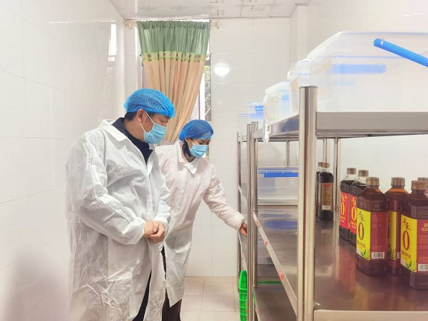 张督学深入食堂,仔细查看相关制度、工作人员操作流程、食材验收台账、工作人员健康证、食品供货商相关资质公示及明厨亮灶等情况。
