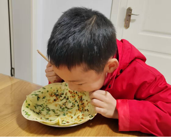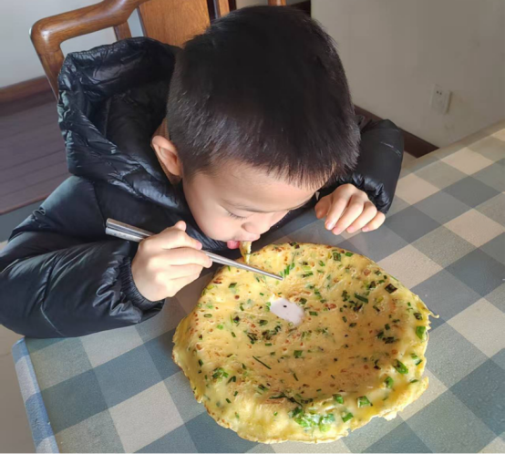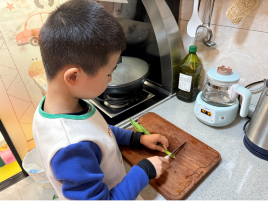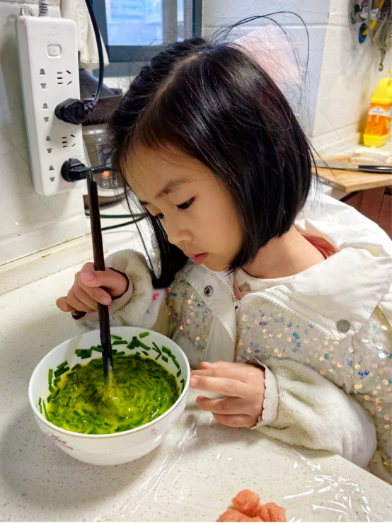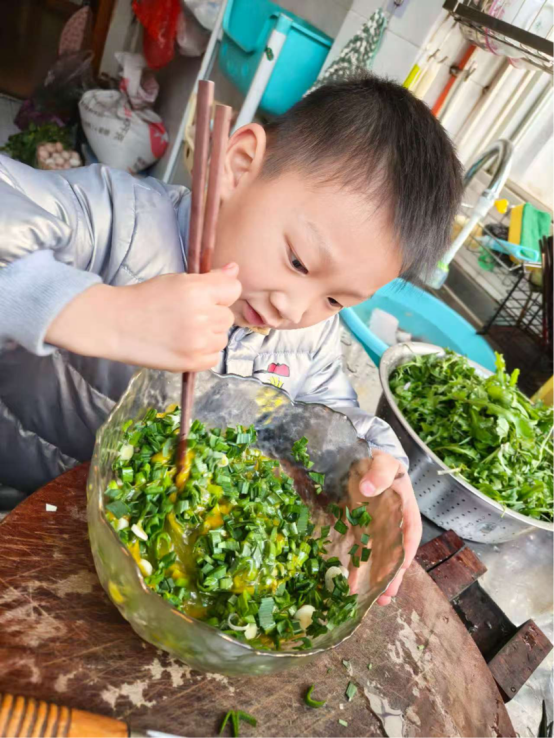 随后,孩子们带着收获的蔬菜满心欢喜地回到家中。他们系上小围裙,洗手准备,正式开启“小厨神”模式。有的孩子在家长的帮助下切菜,小手紧紧握住刀柄,一下一下,有模有样;有的负责搅拌蛋液,筷子在碗里快速转动,溅起小小的水花。不一会儿,厨房里就飘出葱花炒蛋、韭菜盒子的诱人香气。