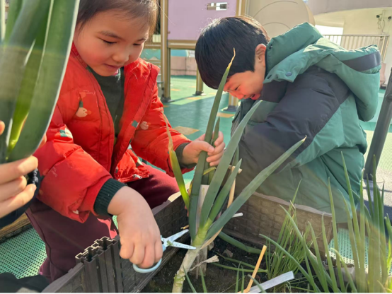 快看!我们的班级植物角大丰收啦!嫩绿的大葱与韭菜在阳光雨露的滋养下茁壮成长,也为孩子们带来了一场特别的实践活动——收割自己亲手种下的大葱和韭菜。