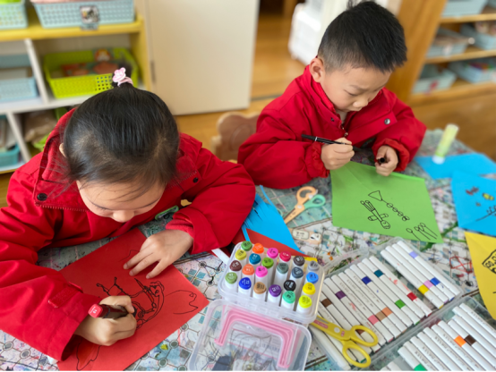带着美好的想象,孩子们迎来了最期待的环节——亲手制作卡纸风筝。老师为大家分发了彩色卡纸、吸管、画笔和胶水,孩子们迫不及待地动起手来。他们在卡纸上画出心仪的形状,有的是灵动的蝴蝶,有的是威风的老鹰,还有的是可爱的小鱼。紧接着,孩子们拿起画笔,精心描绘,为风筝添上灵动的眼睛、漂亮的花纹。随后,用吸管作为支撑,小心翼翼地用胶水粘贴固定,这可是让风筝能“展翅高飞”的关键。遇到困难时,小眉头紧皱,相互交流、请教;完成一部分,又骄傲地向小伙伴展示。