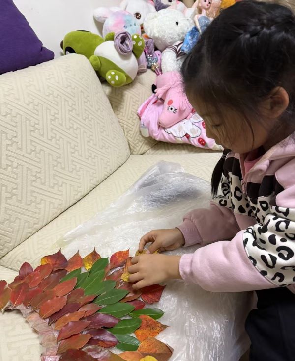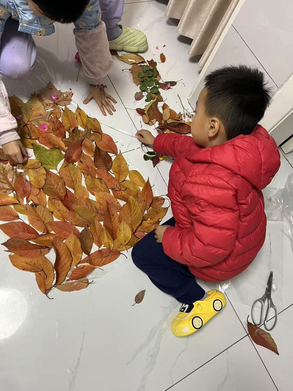 活动前期,孩子们化身小小设计师,在爸爸妈妈的帮助下,利用各种树叶和环保材料设计出了属于秋天的美丽服饰。