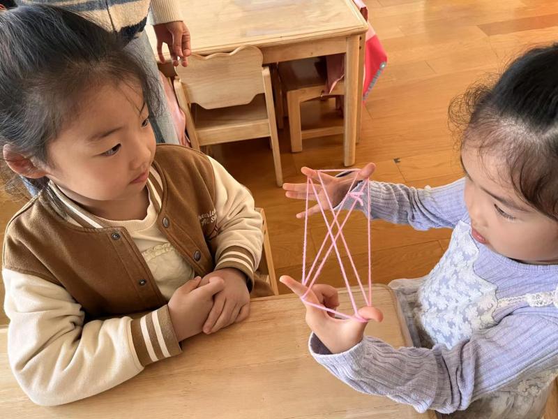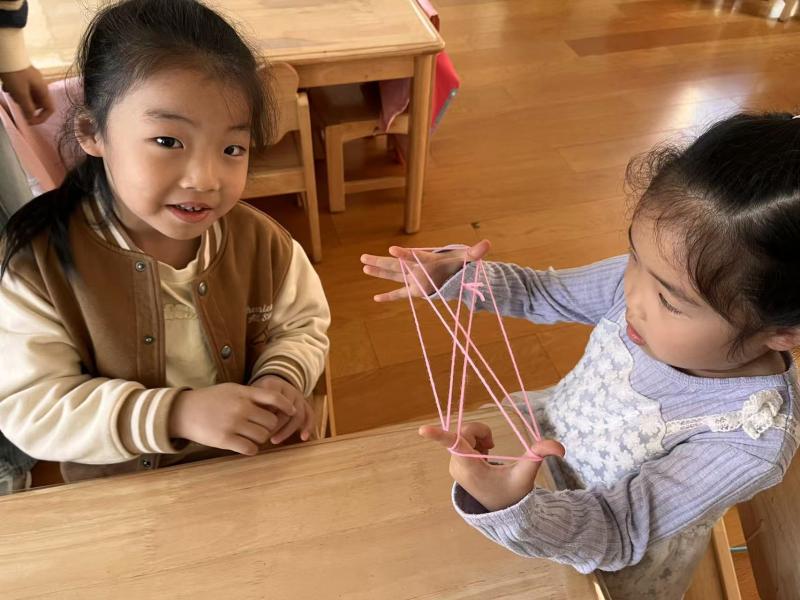 翻花绳游戏,俗称“线翻花”、“翻花鼓”,是我国许多地方广泛流传的一种民间游戏。仅仅一根绳子通过不同的翻法就可以变换出不同的造型来,既可以自娱自乐,也可以两人或多人相互合作轮流翻出各种造型。午饭后,大三班的小朋友们总喜欢拿出一根绳子,和小伙伴们在一起玩起了“翻花绳”的游戏。一根绳子,双手的十根手指巧妙灵活的动作、左右手的协调配合,通过撑、压、挑、翻、勾等一些精微的动作,便可以翻出各种生动有趣的造型图案。花样翻绳游戏既锻炼了幼儿的手指灵活性,又可以培养幼儿的观察力、想象力和动手能力,大大丰富了幼儿的课余生活,令他们沉浸在无尽的乐趣之中。在游戏中,孩子们相互配合、相互鼓励、相互帮助更加加深了小伙伴之间的友谊。