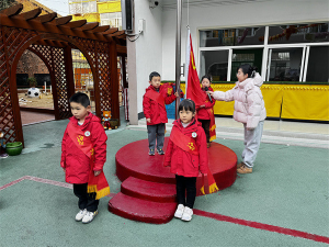 12月,大一班的部分小朋友很荣幸的担任了小旗手。他们身姿挺拔,迈着坚定的步伐在阳光下升国旗。