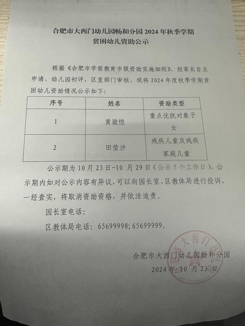 【公示信息】畅和分园:2024年秋季贫困生公示