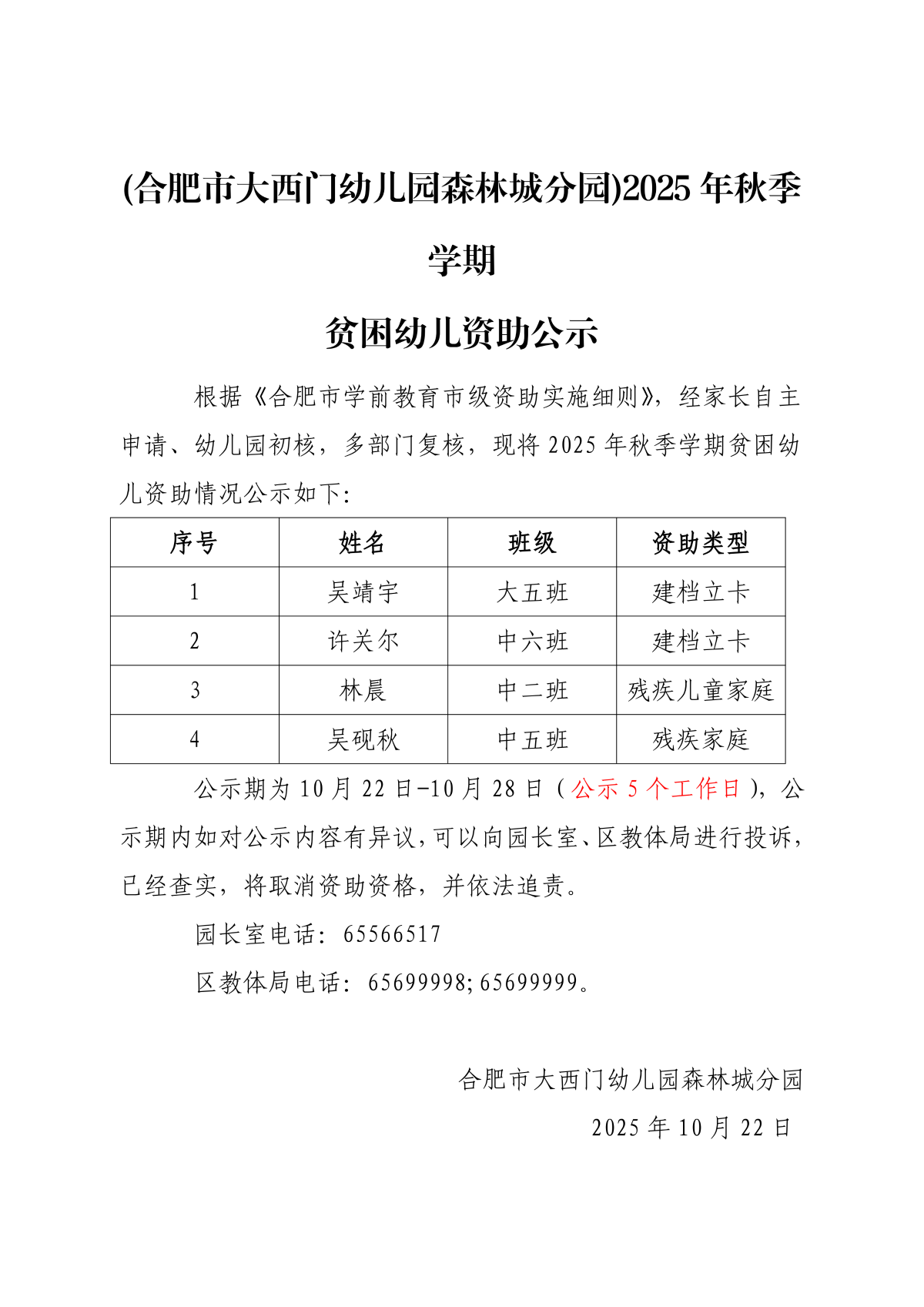 【公示信息】森林城分园:2025年秋季学期贫困幼儿资助公示