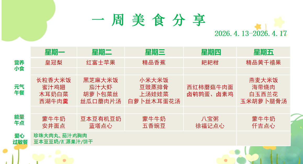 【一周食谱】集团:幼儿食谱(2026.4.13-2026.4.17)