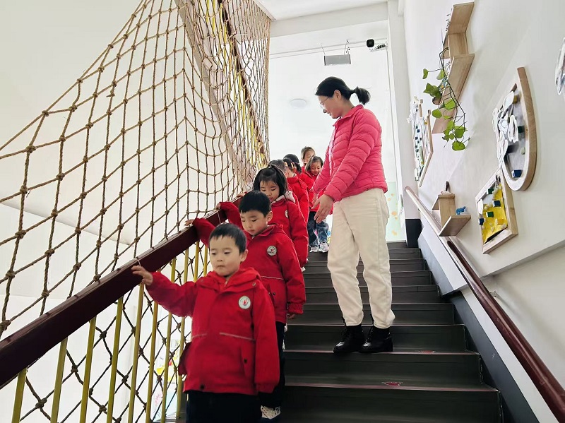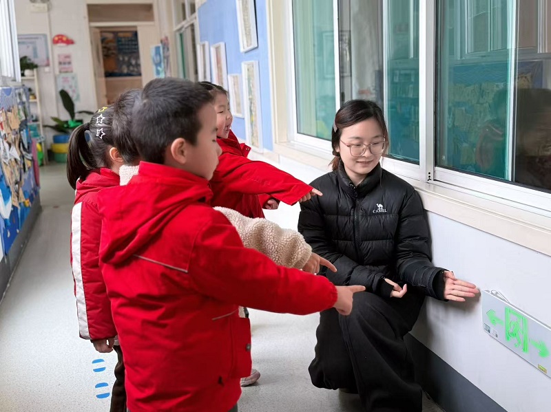 演练前,各班教师依据幼儿年龄特点,通过绘本、儿歌、情景模拟等形式,开展防踩踏专题教育。孩子们在模拟上下楼梯、走廊通行的场景中,学习“弯腰扶墙、有序前行”的避险姿势,熟悉疏散流程,在实践中增强自我保护能力。