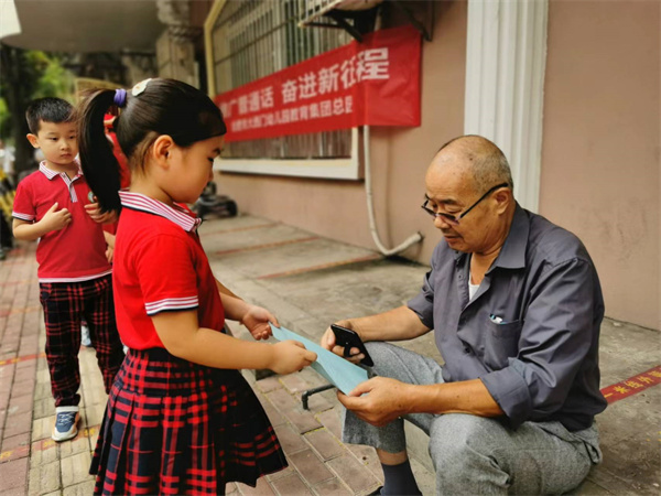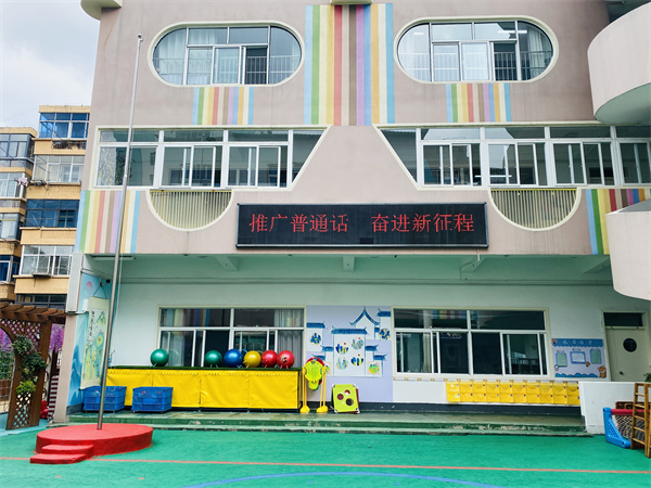 活动期间,利用LED电子屏幕、宣传栏张贴海报、推普宣传横幅以及在幼儿园门口设立推普周展台等多种方式来开展推普宣传活动。在老师的带领下,“小小推普员”来到路边,一边热心地将推普宣传单发到爷爷、奶奶、叔叔、阿姨的手中,一边耐心地讲解着说好普通话的重要意义,使家长明确推普周活动的重点,提高家长的推普意识,营造良好的推普氛围。
