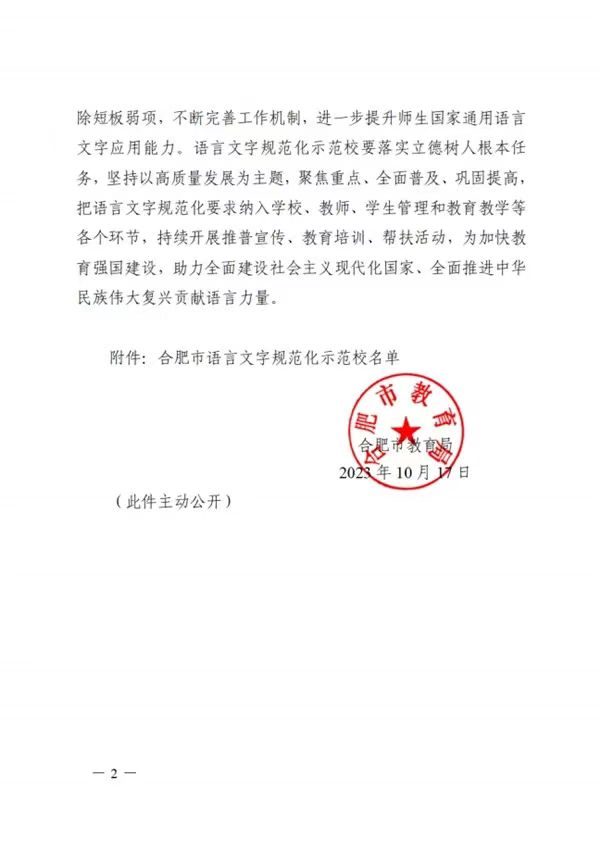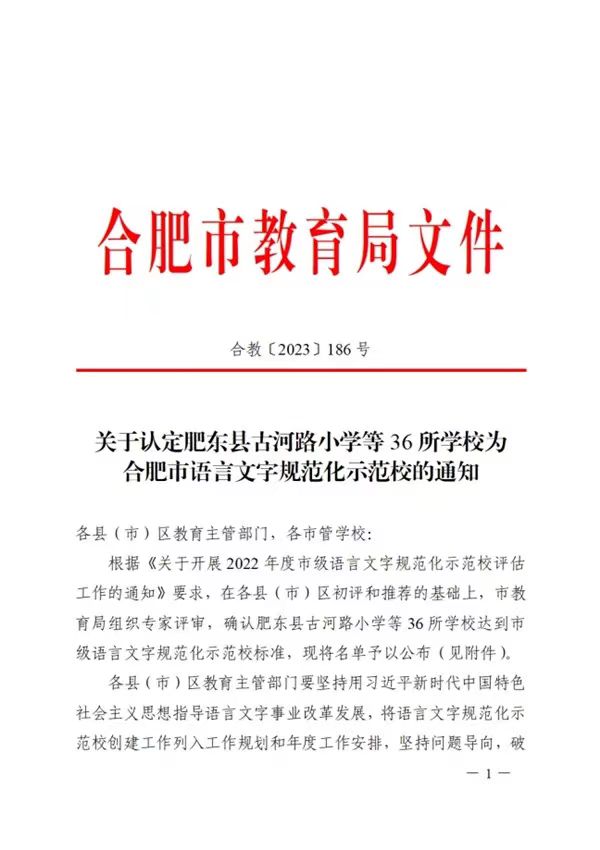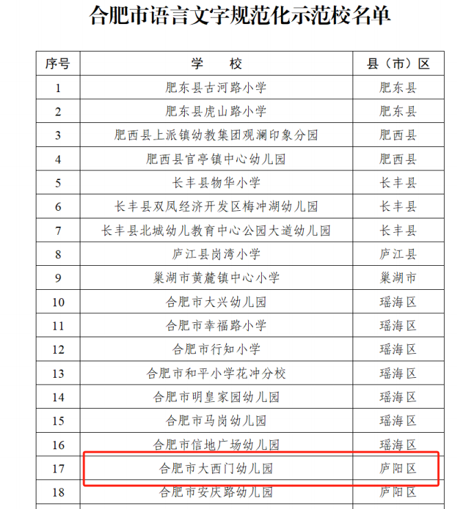 10月17日,合肥市教育局发布了《关于认定肥东县古河路小学等36所学校为合肥市语言文字规范化示范校的通知》,合肥市大西门幼儿园顺利通过专家组层层评审,成功获评“合肥市语言文字规范化示范校”。
