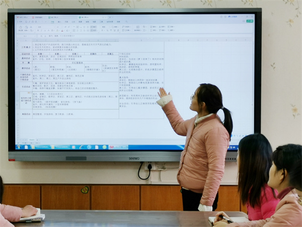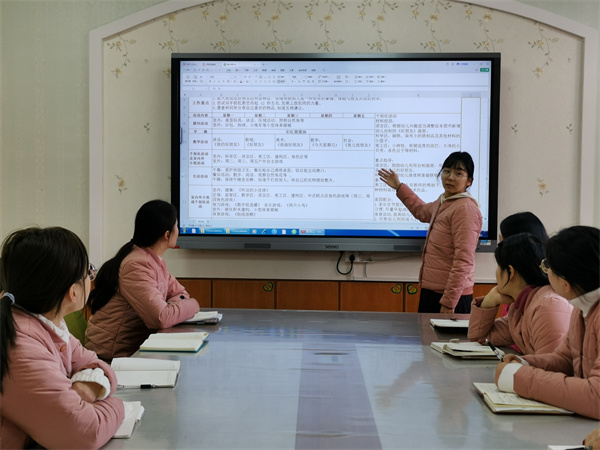 周计划是幼儿园一项重要的工作计划,体现教师对班级保教工作的一周安排,是班级保教质量的前提。大家互相观摩、学习,彼此交流,在交流中聚焦“教育活动目标”“户外活动材料的投放”“区域游戏是否围绕主题”等问题进行深度讨论。