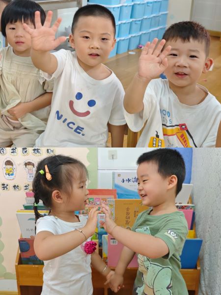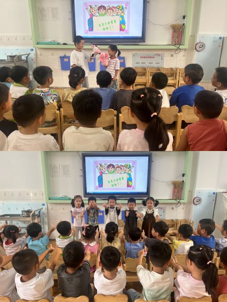 小班组老师们在活动中注重情景的创设,让每一位孩子都能主动参与到说普通话,爱说普通话的活动中,通过“每天一句普通话,你说我说大家说,你好、早上好、谢谢”的活动大胆与同伴、老师进行交流和游戏。在和谐宽松的氛围中鼓励孩子说好普通话,感受语言文化的魅力。