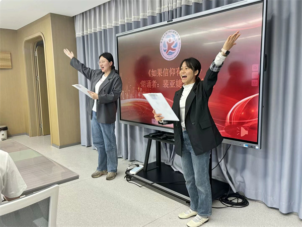 书页间藏着星辰大海,诵读里遇见万千世界。固镇路分园老师们积极响应世界读书日的号召,开展了“美文诵读”活动。活动中,老师们分组以精神饱满的状态进行朗诵表演展示自我,她们或铿锵有力、或婉转深情,将《如果信仰有颜色》的爱国豪情、教育叙事中的点滴感动融入朗诵。现场观众也在《做好的自己》的共鸣中感受到文字的力量,以及诗歌的优美。老师们在有节奏、有韵律的语言中欣赏诗歌带来的精神力量,让文字的力量穿透喧嚣,直抵心灵!