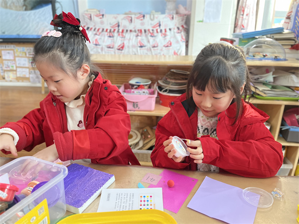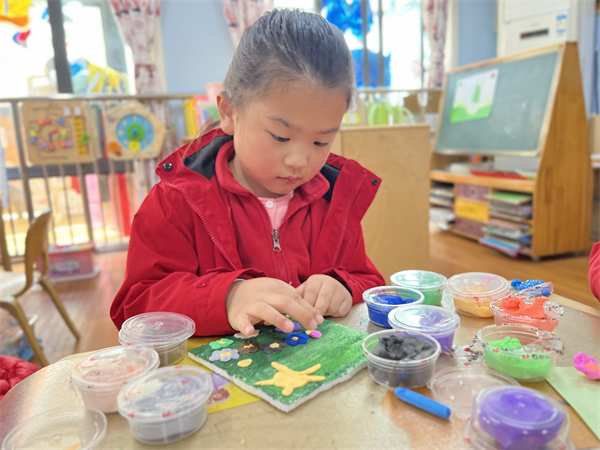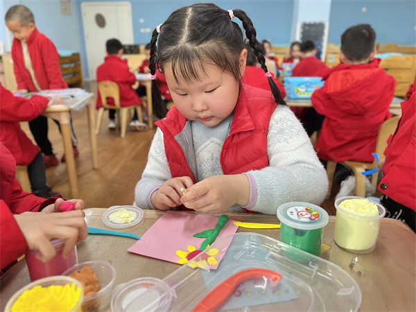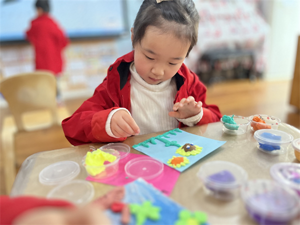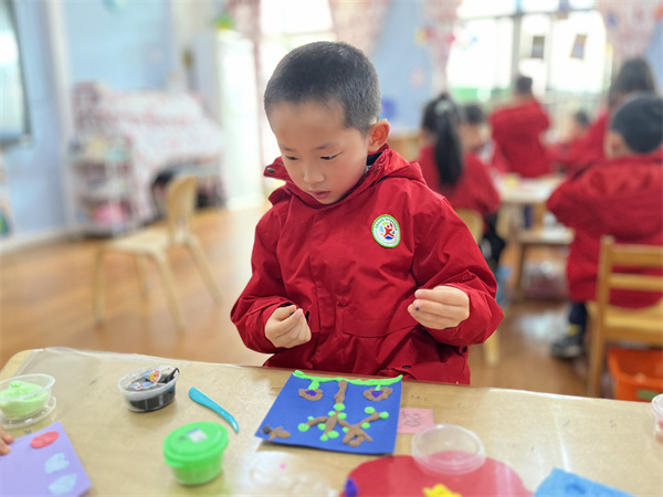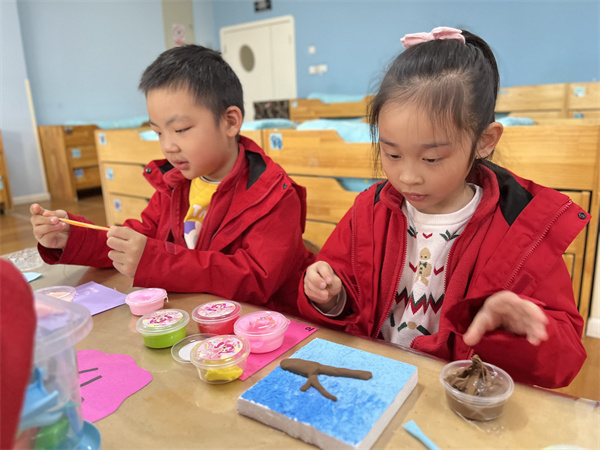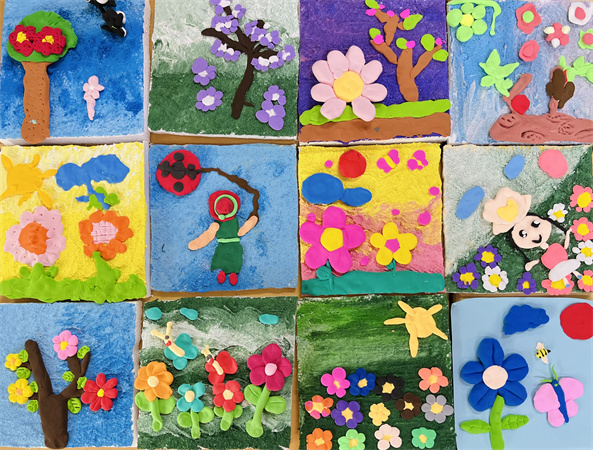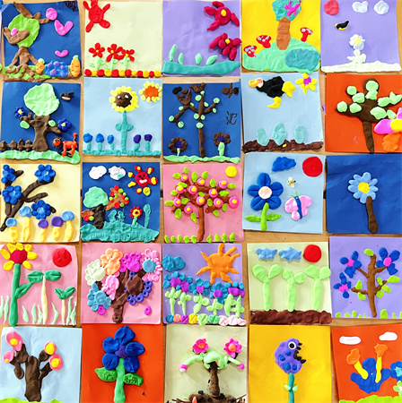 回到教室后,孩子们在老师的指导下利用超轻黏土,采用撮、团、压等方法,大胆想象,创作了自己脑海中的美丽春景,每个孩子的景色都不一样,瞧!多漂亮呀!各种各样、丰富多彩的黏土画如同孩子们充满童真的内心世界,单纯而绚丽。
